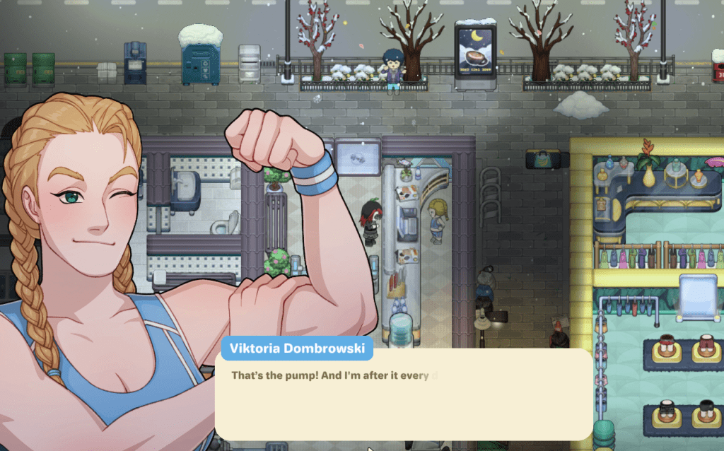 Finalmente tenemos el sistema de necesidades, se siente equilibrado para la velocidad del juego y el tiempo que conlleva hacer diferentes acciones, creo que refleja bastante bien cómo el sistema se siente en la vida real, nuevamente, al igual que en los sims, realizar determinadas acciones baja o sube diferentes necesidades de forma acorde. Tenemos un sistema de “temperatura interna” que es visible en todo momento y la ropa que escojamos lo afecta, además si tu temperatura es muy alta puedes darte duchas de agua fría para bajarla o si es muy baja puedes darte una ducha de agua caliente para subirla. También tiene un sistema de enfermedades claro que no da lugar a dudas, si te tiras toda la noche de invierno en tirantes fuera mientras nieva te vas a resfriar sí o sí y puedes tomar medicina para acelerar tu recuperación o tomarte la vida con calma y recuperarte con tiempo.