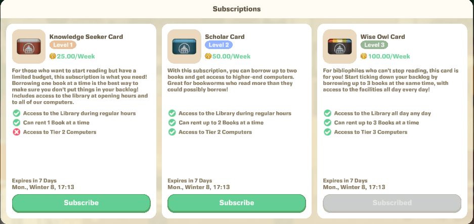 Me gustan muchísimo las habilidades que han escogido y cómo las haces crecer, se han basado en los Sims y se nota, por ejemplo puedes leer libros y revistas en la biblioteca DONDE PUEDES TENER TU PROPIO CARNET (renovado semanalmente y las autorenovaciones por desgracia no parecen bien implementadas) Y SACARLOS PRESTADOS Y DEVOLVERLOS Y TIENES TIEMPO PARA DEVOLVERLOS!!! ó puedes simplemente realizar una habilidad asociada para ello. Si pierdes un libro debido a un bug lo tienes que pagar :c